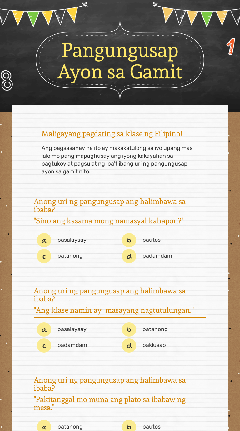 Sa kasalukuyan mayroong 5 uri ng pangungusap tayong pinag-aaralan. 1 2 PAGSASANAY Saan Bakit Ano Sino Panuto. BANTAS Sa paksang ito ating tatalakayin kung ano nga ba ang mga uri ng bantas at ang mga gamit nito sa pangungusap.